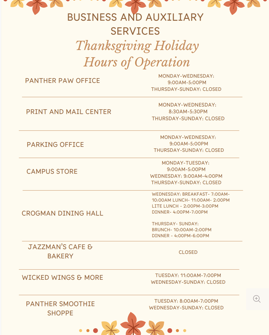 Our goal is to provide excellent customer service as quickly, conveniently, and efficiently as possible. As you explore our webpage, you will find Business and Auxiliary Services consists of several services offered on a daily basis, with direct report areas like the Campus Store, Dining Services, Panther Print & Mail Center, Parking Office, the Panther PAW Card Office, and University Meetings and Events. In addition to these areas, we also manage the contracts for snack and beverage vending, vending with CAU (Market Thursdays/Homecoming), Pure Water units, ATM services (PNC only), and washers/dryers located in the residence halls.