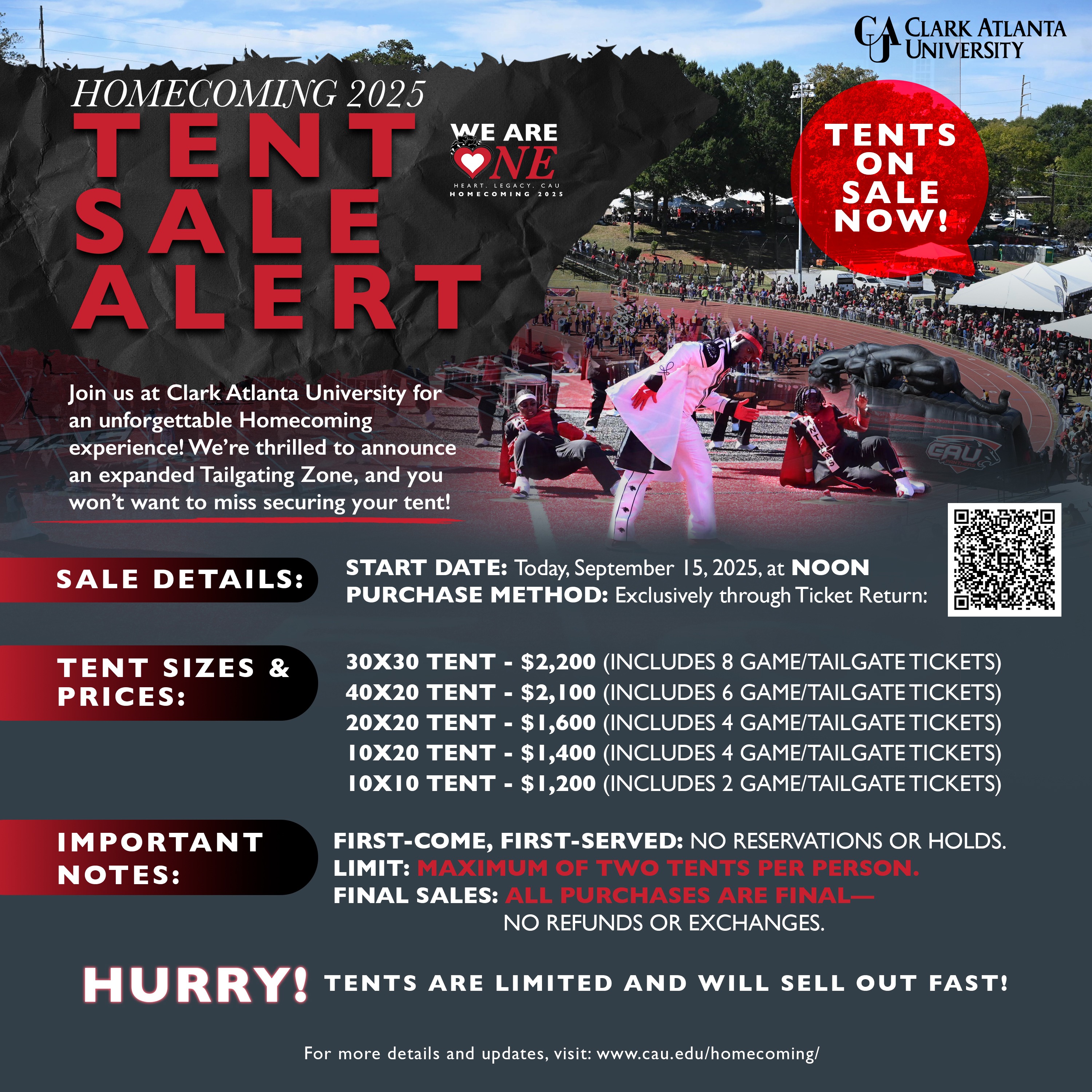Mark your calendar for October 25th at 12:00 pm EST! Don’t miss your chance to snag a tailgate tent for CAU Homecoming. Act fast – supplies are limited!